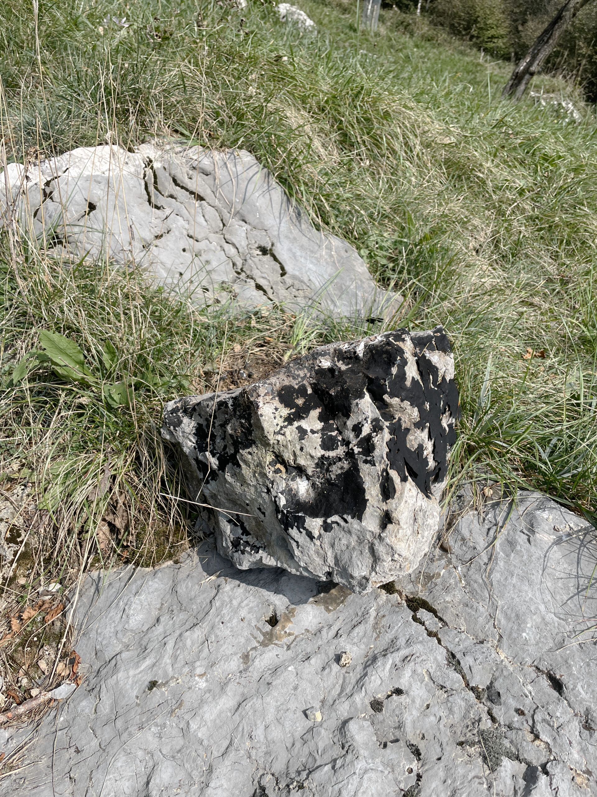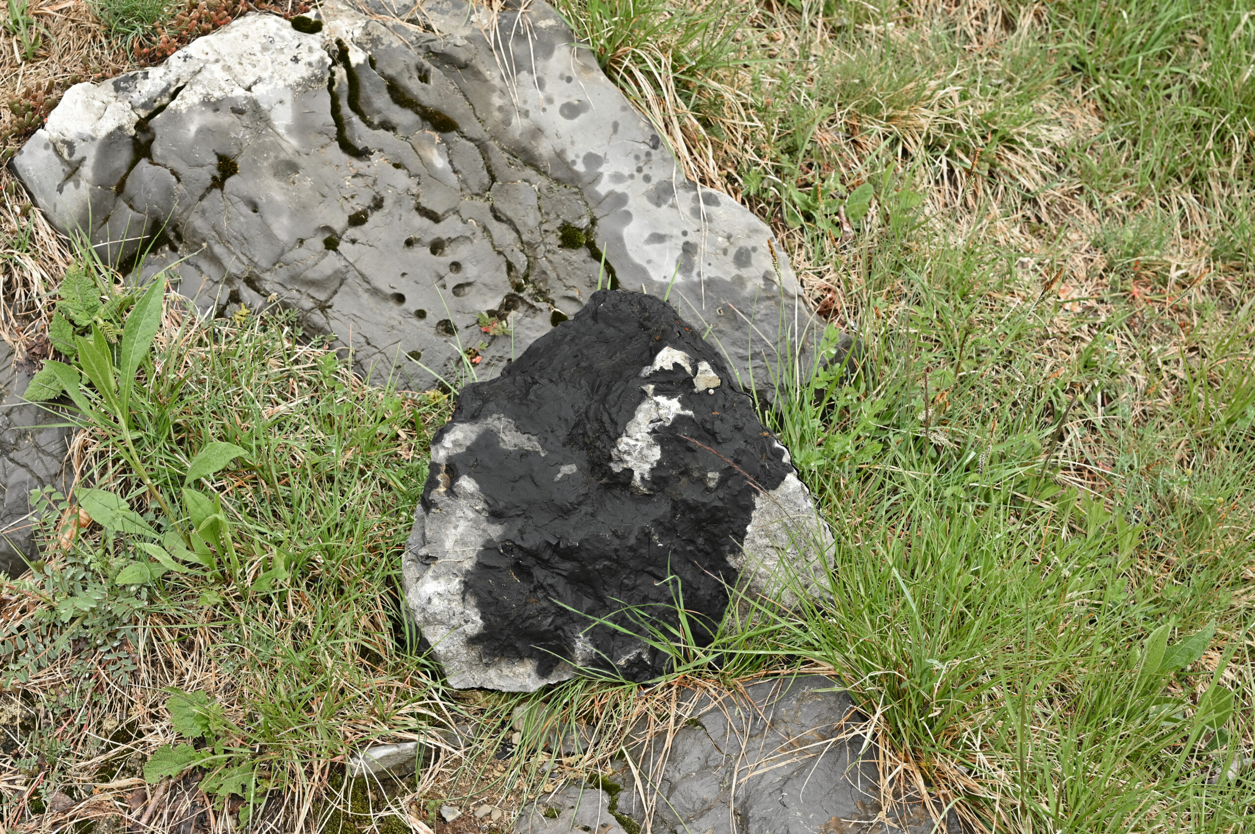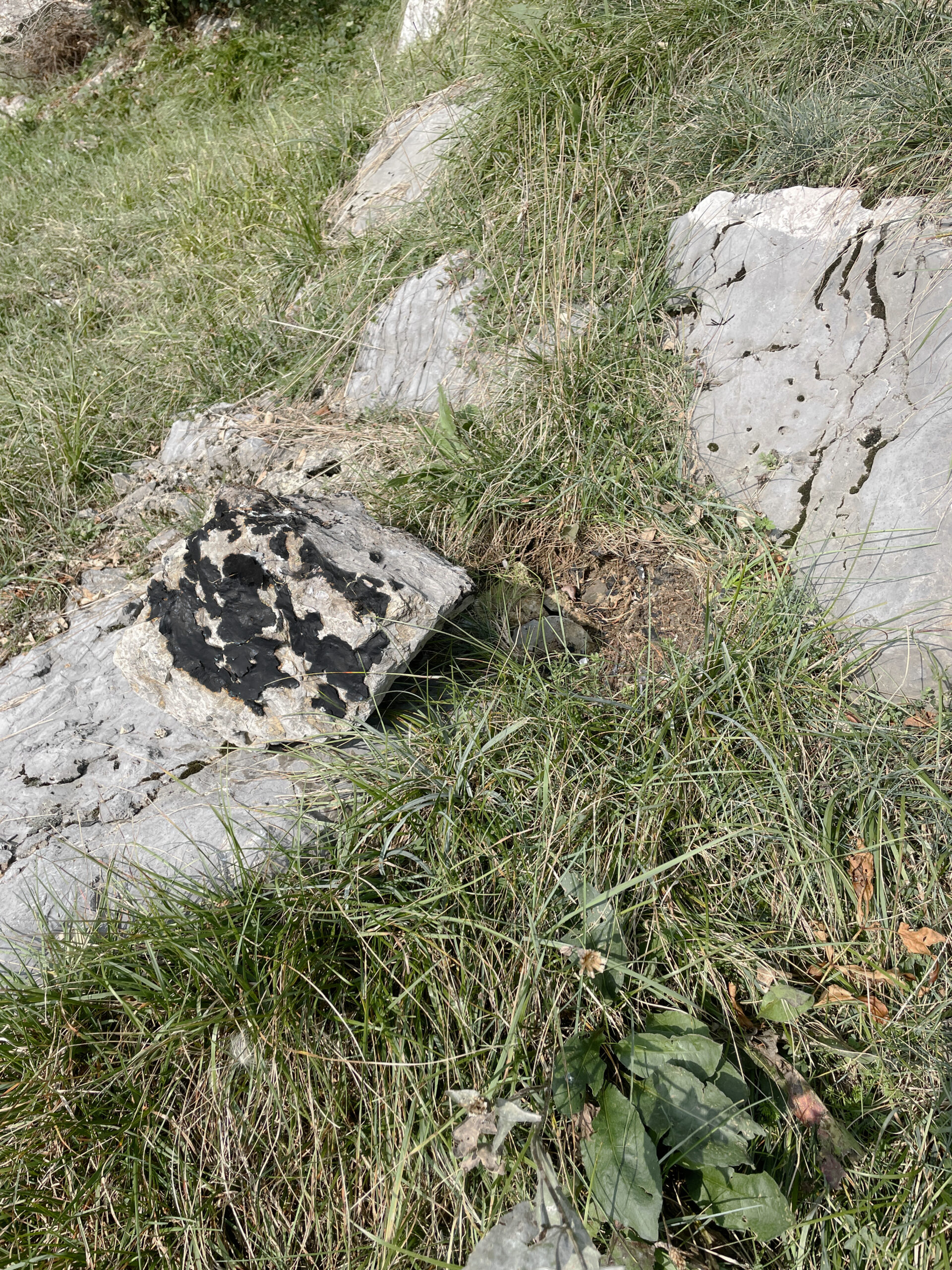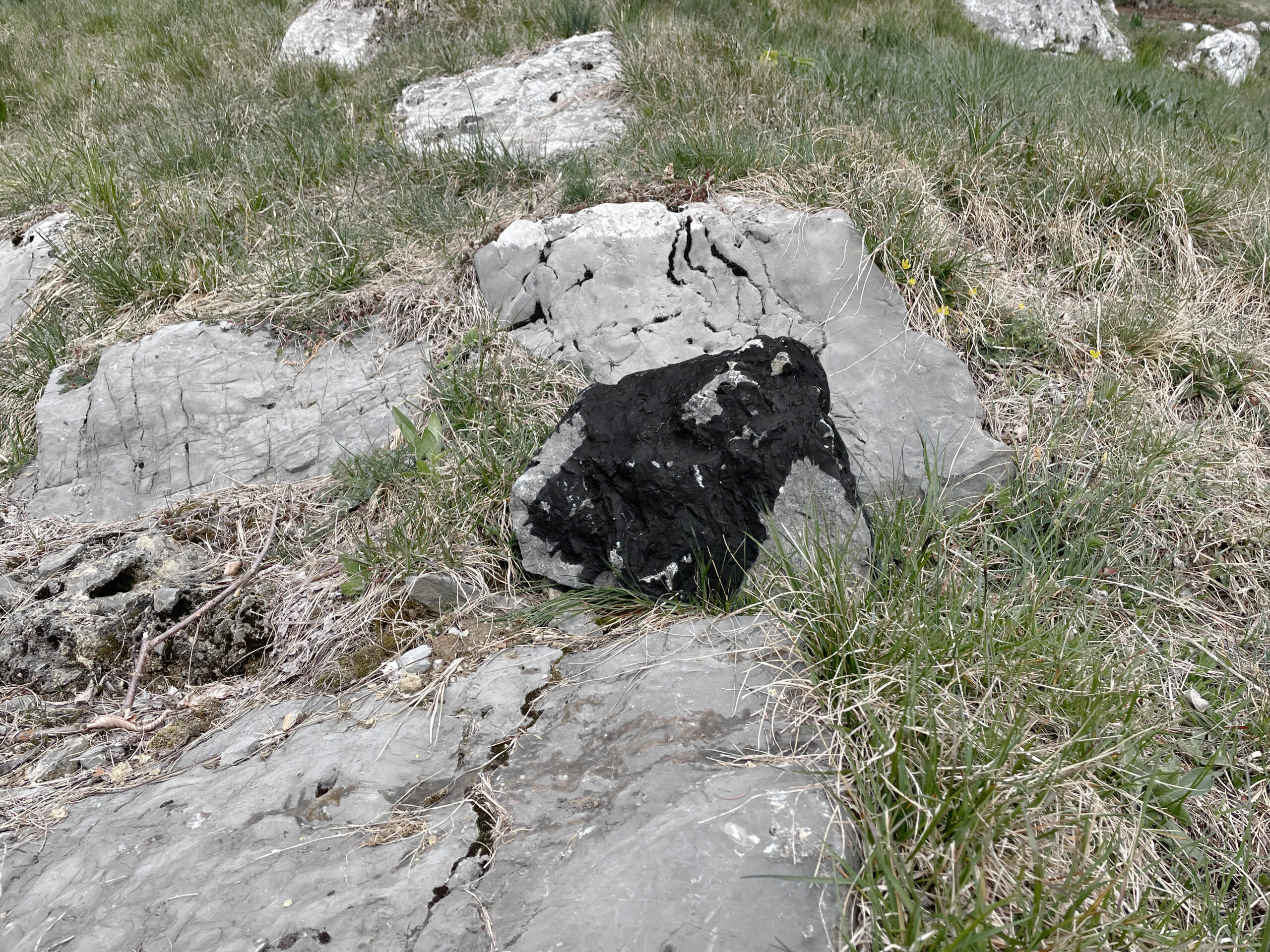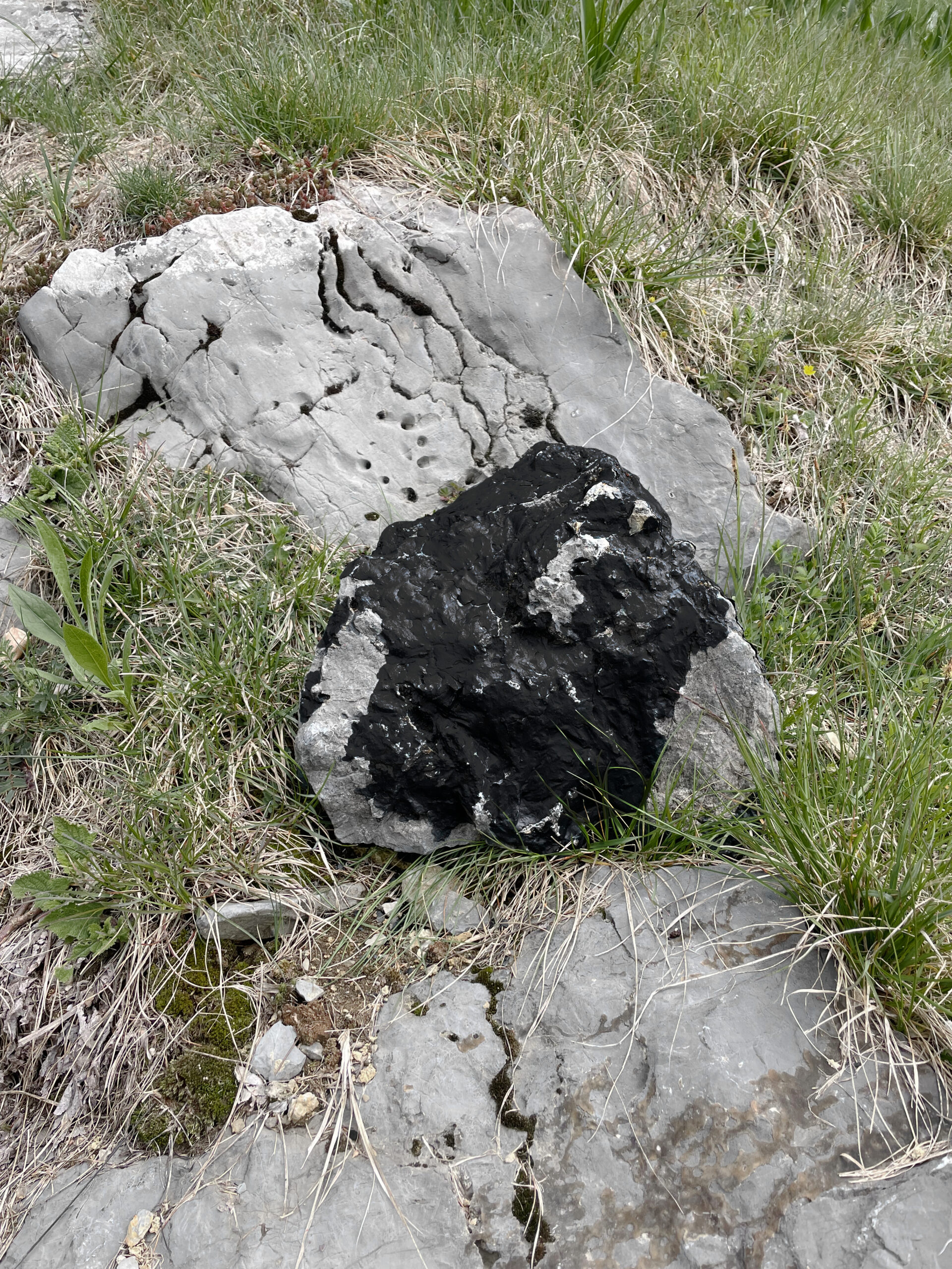 A stone was taken from the mountain and painted with a special matt black colour, ‘flattening’ its appearance as much as possible. The stone thus became a contour or a shape seen from afar, losing its spatiality. Then the stone was brought back to the place where it was originally found and left there in the wild. In the following months, the stone started peeling off, revealing its original nature and losing the black coating.
