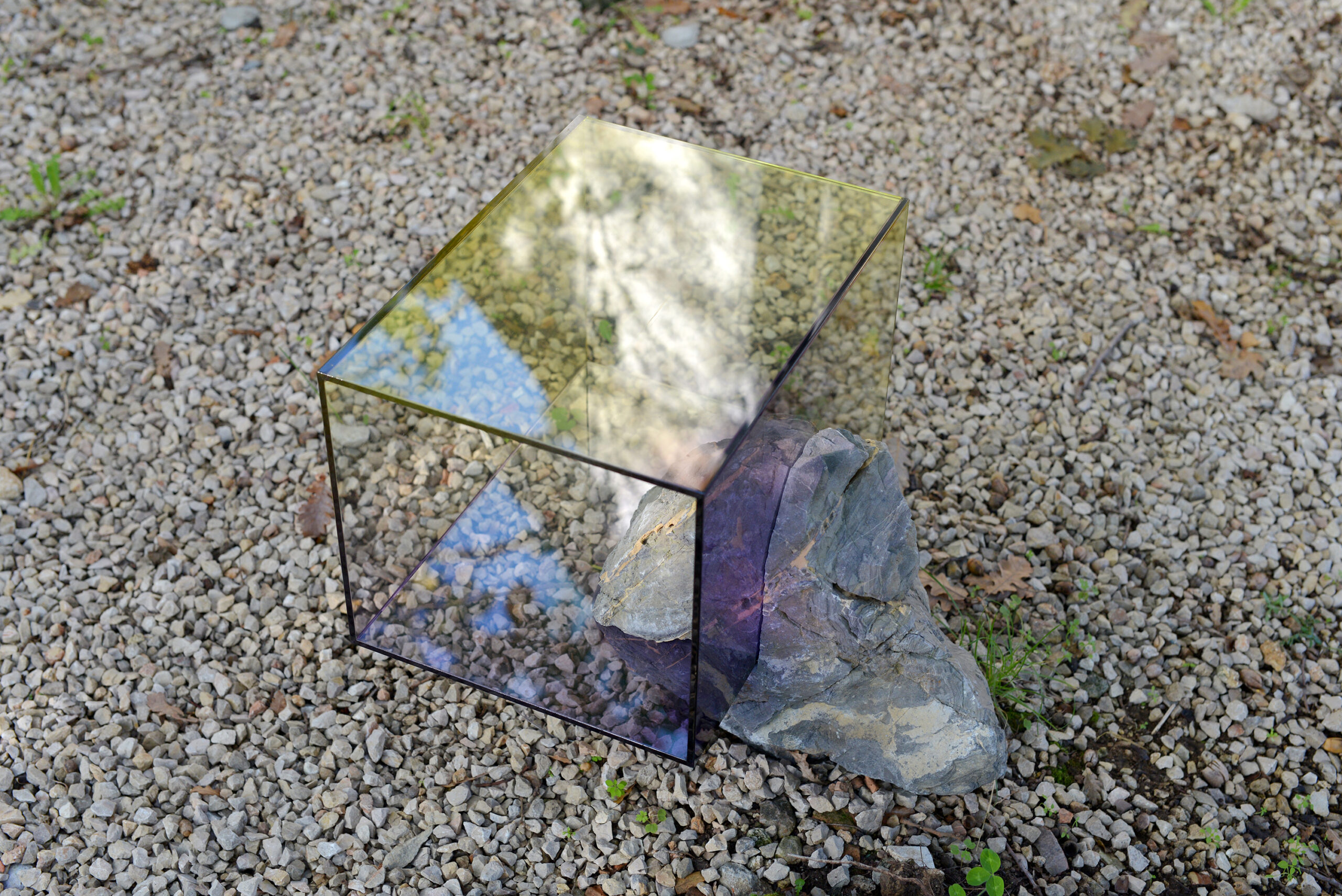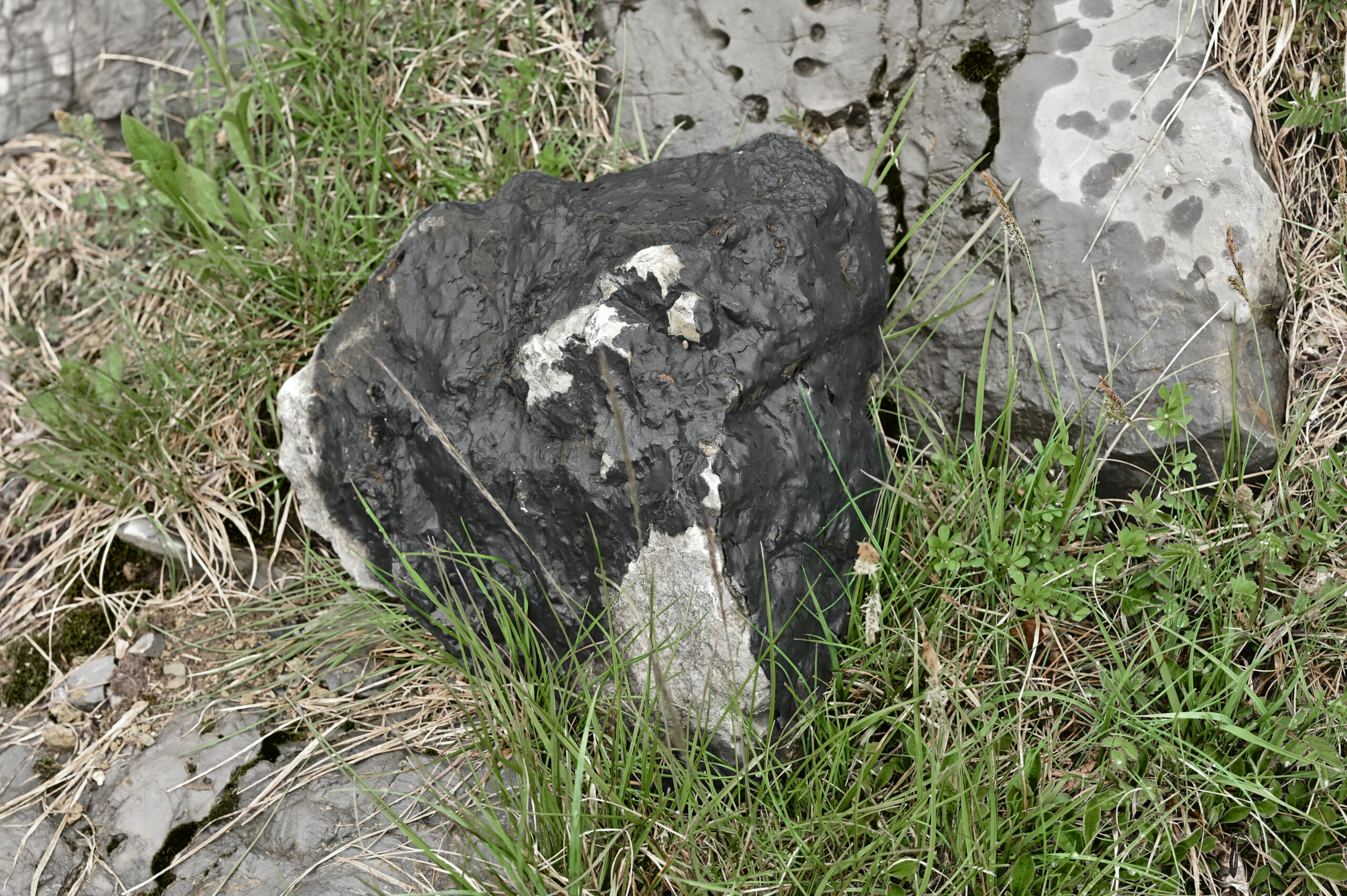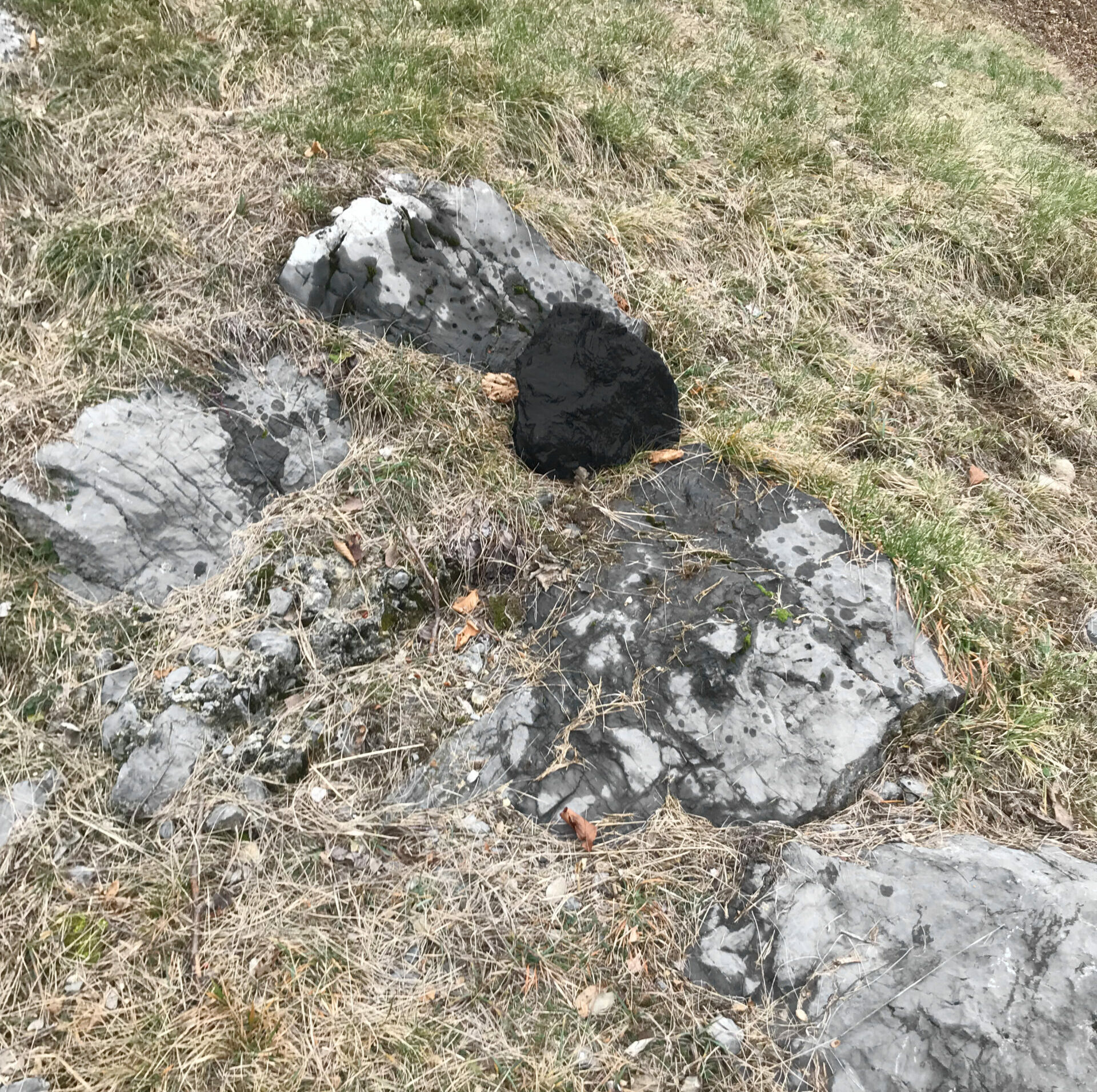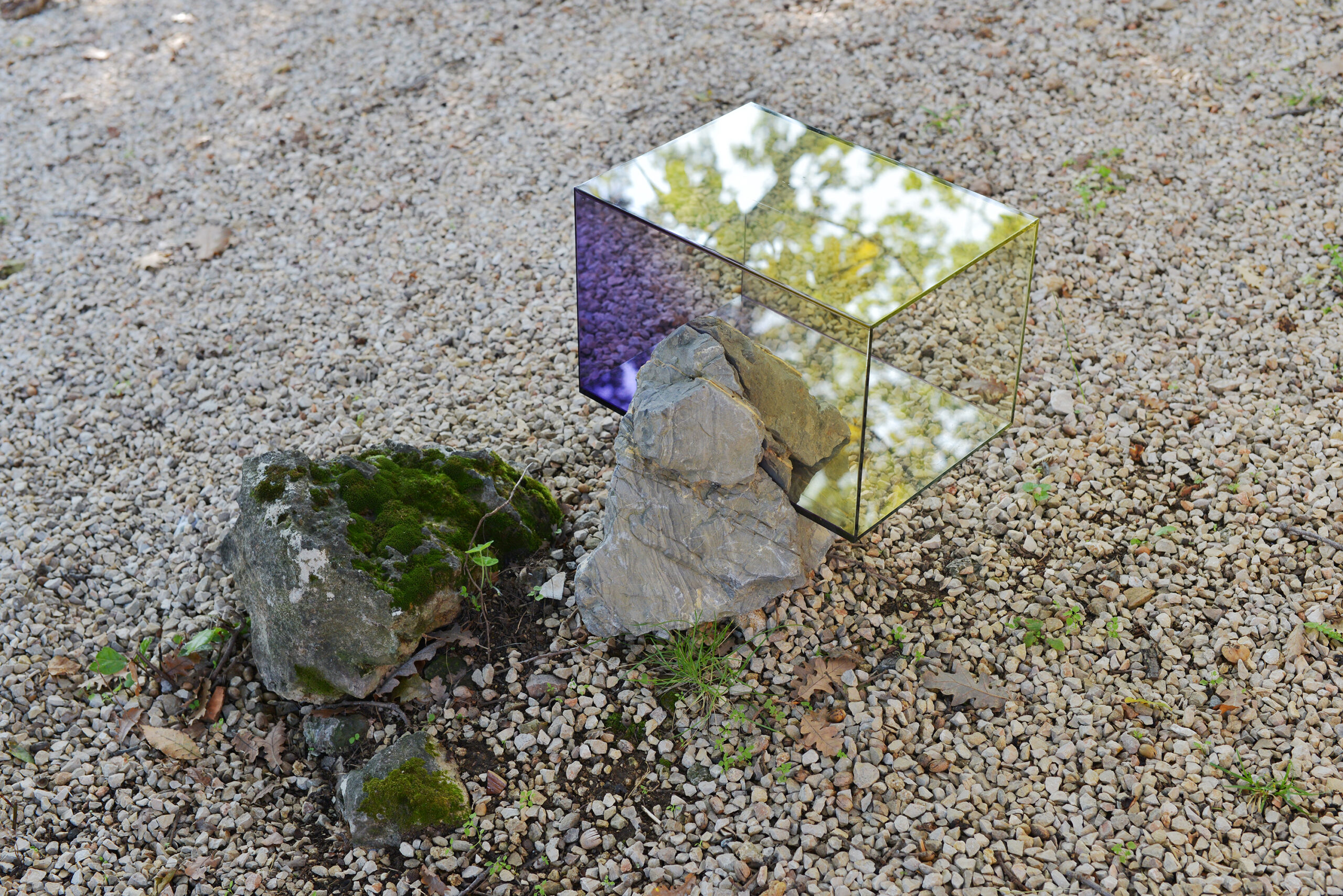 A stone was taken from the mountain and painted with a special matt black colour, ‘flattening’ its appearance as much as possible. The stone thus became a contour or a shape seen from afar, losing its spatiality. Then the stone was brought back to the place where it was originally found and left there in the wild. In the following months, the stone started peeling off, revealing its original nature and losing the black coating.