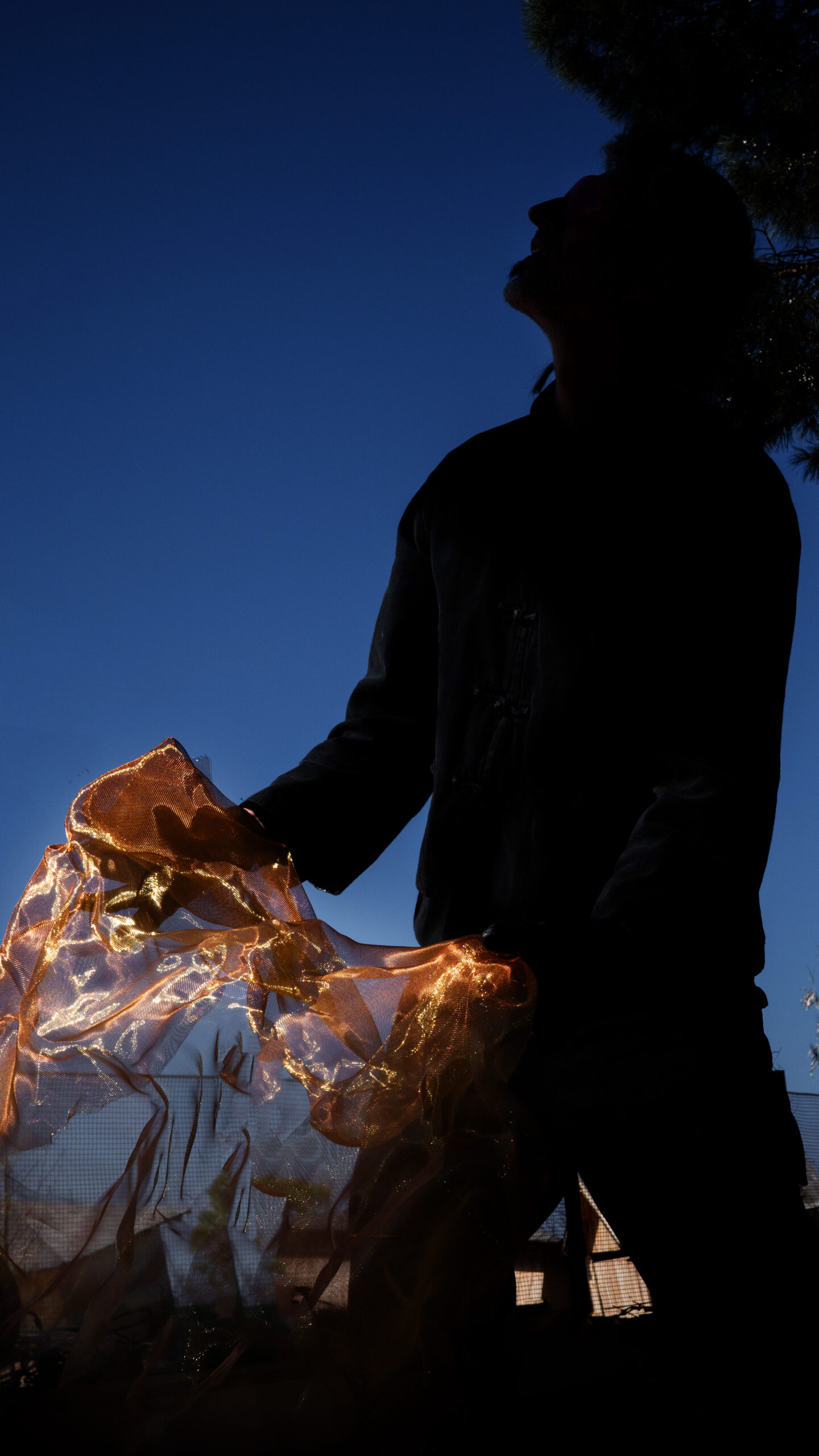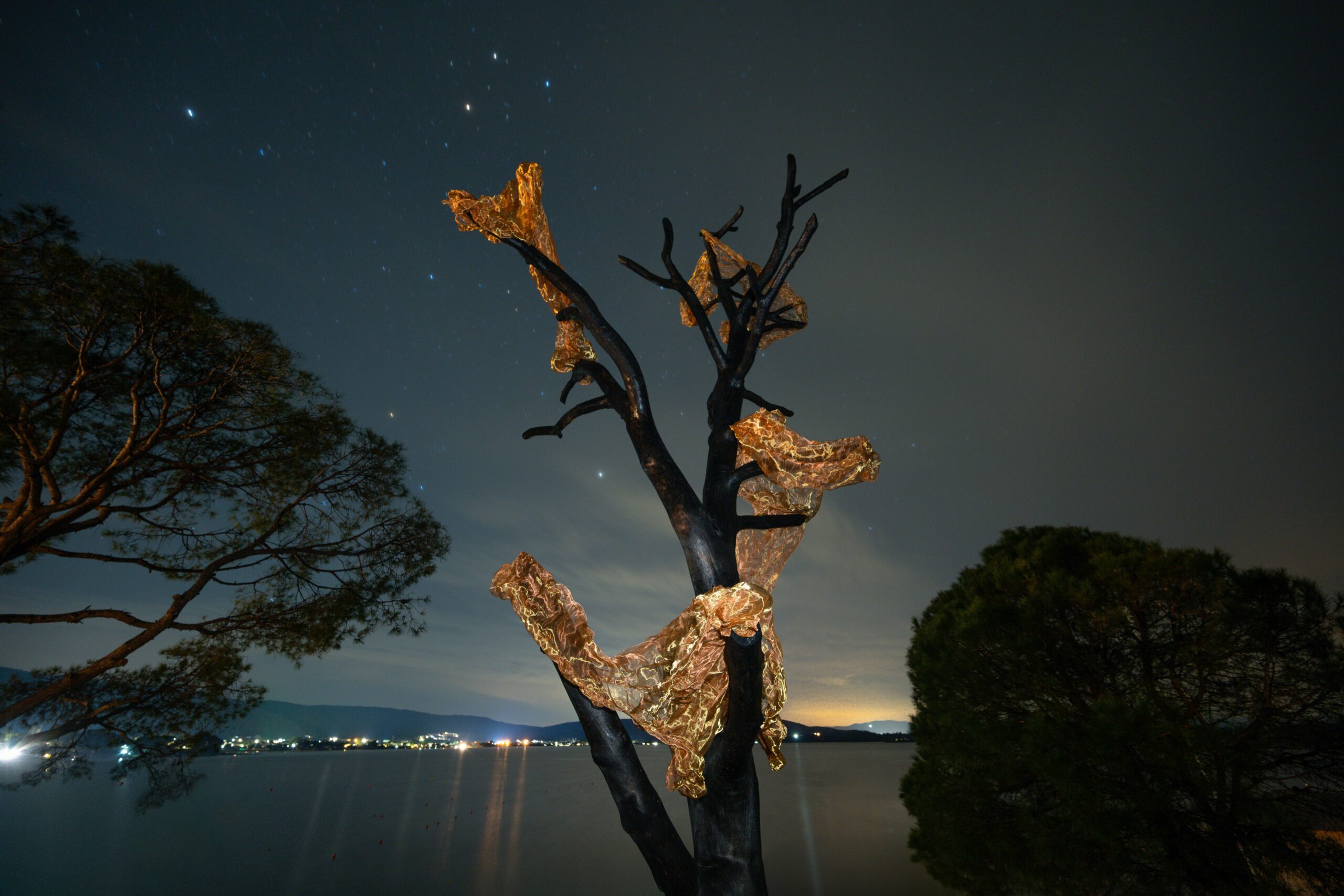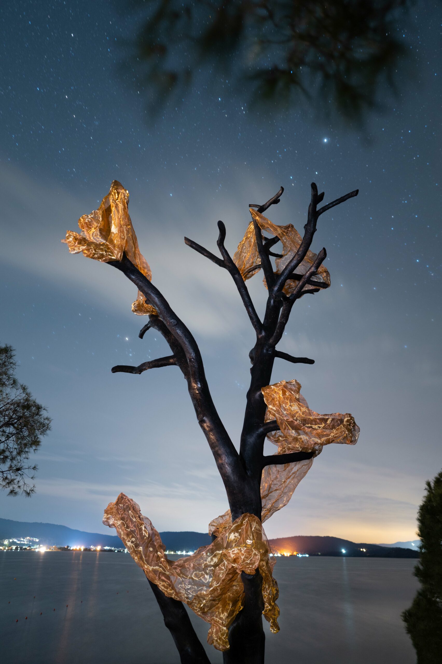 The memory of the foliage is in turn substituted by a golden-red fabric-like mesh composed of copper and brass that will be altered through oxidation in time and become green-brown inverting in a sense the process of fire itself. The Pine tree finds thus new life after it’s apparent death, living on as a symbol but also as an active member of the ekies community (of humans and non-humans) that owes a lot to these silent giants.
