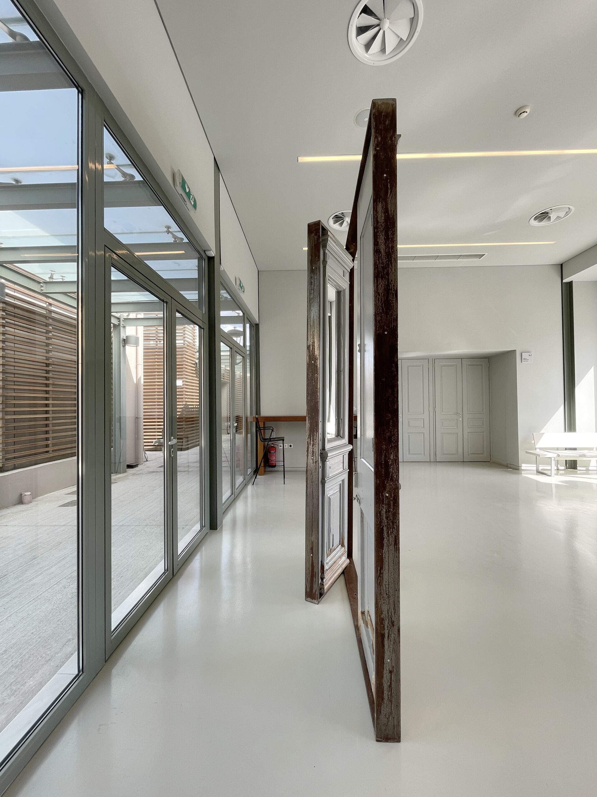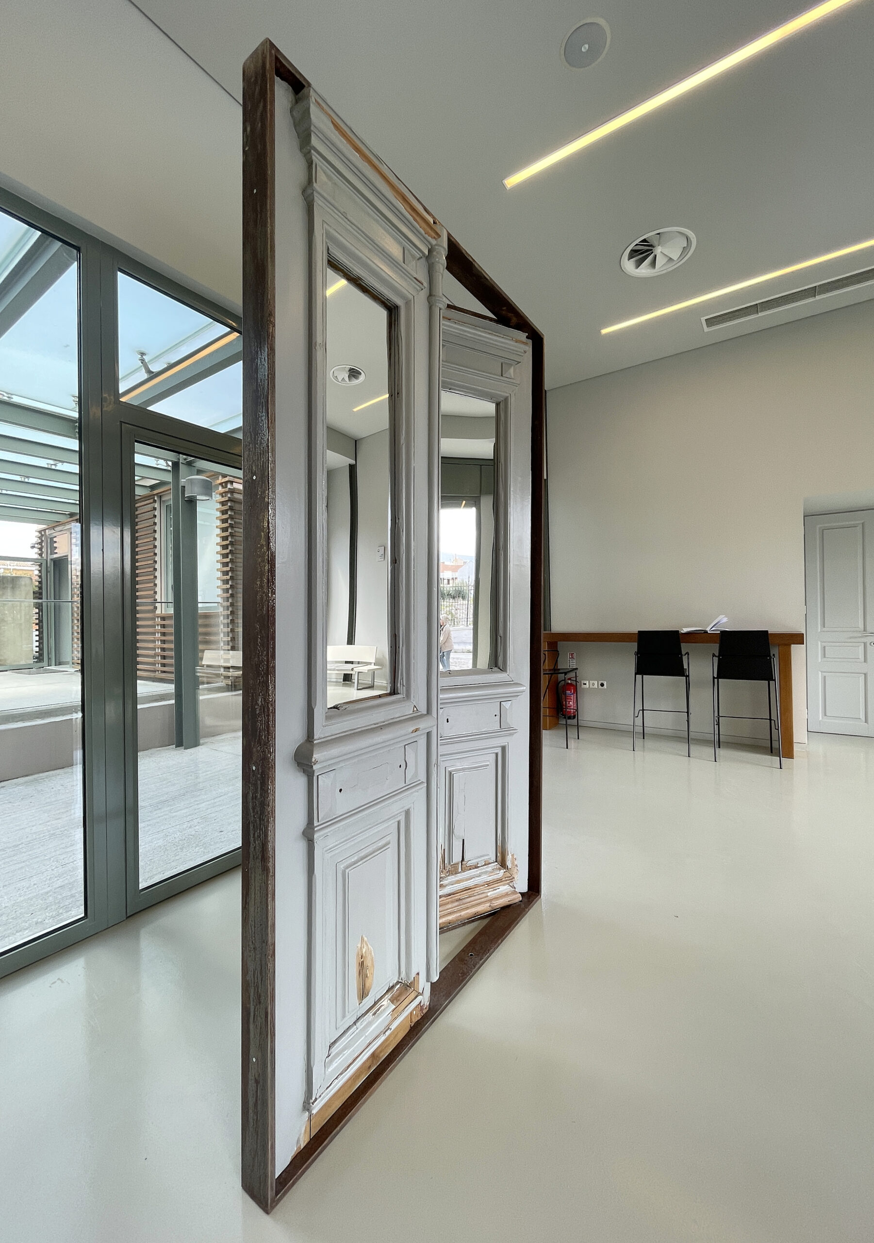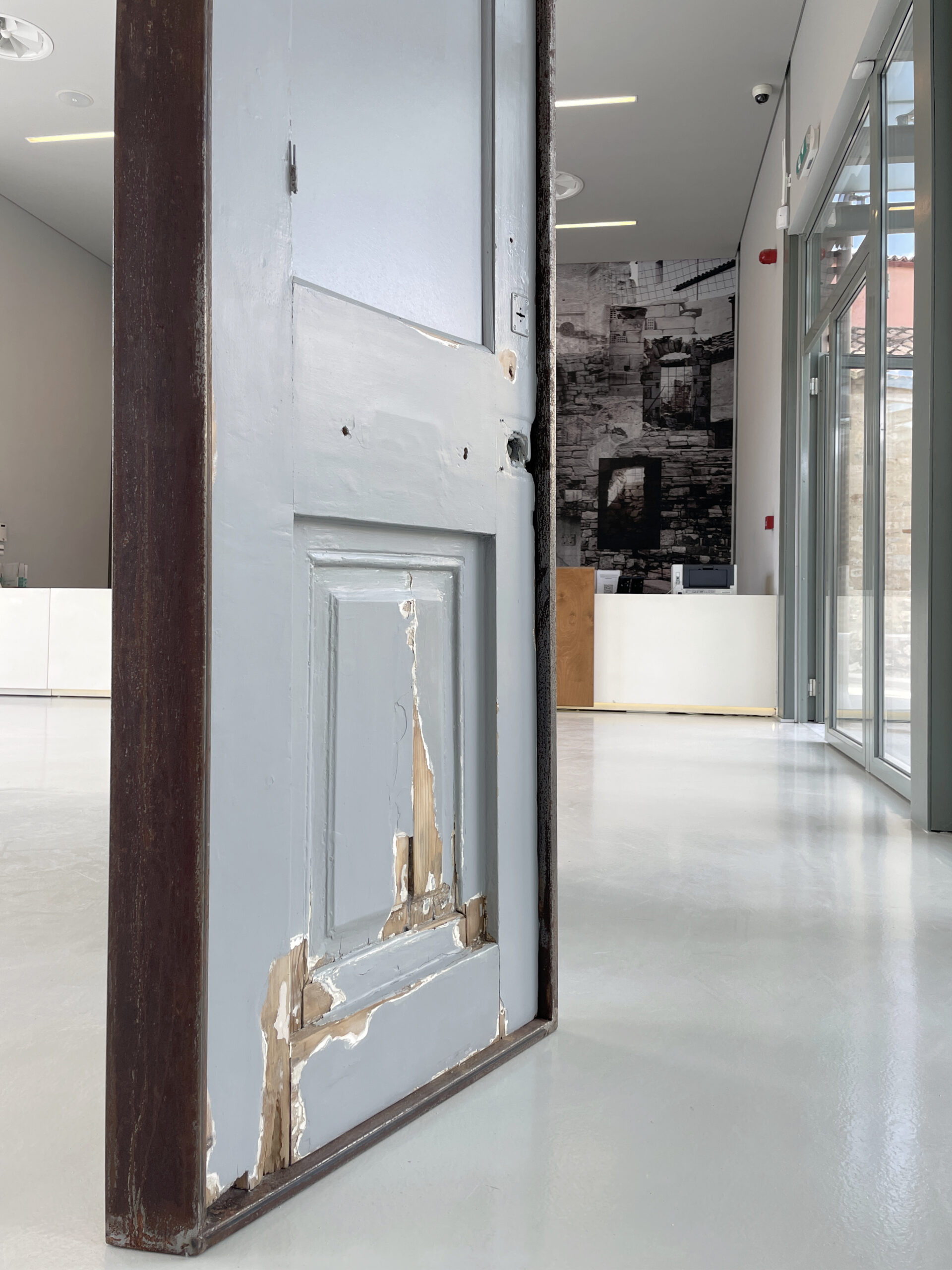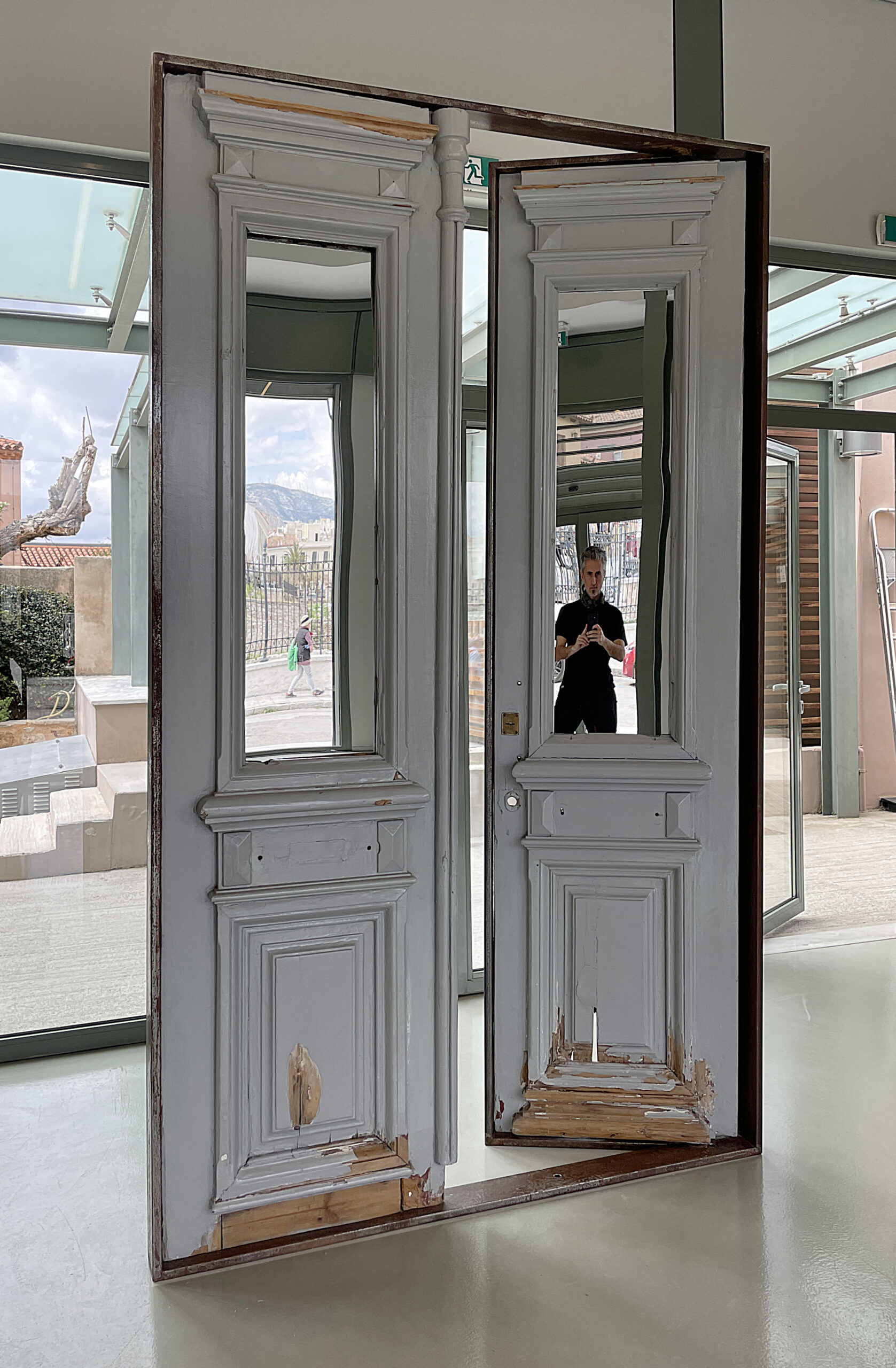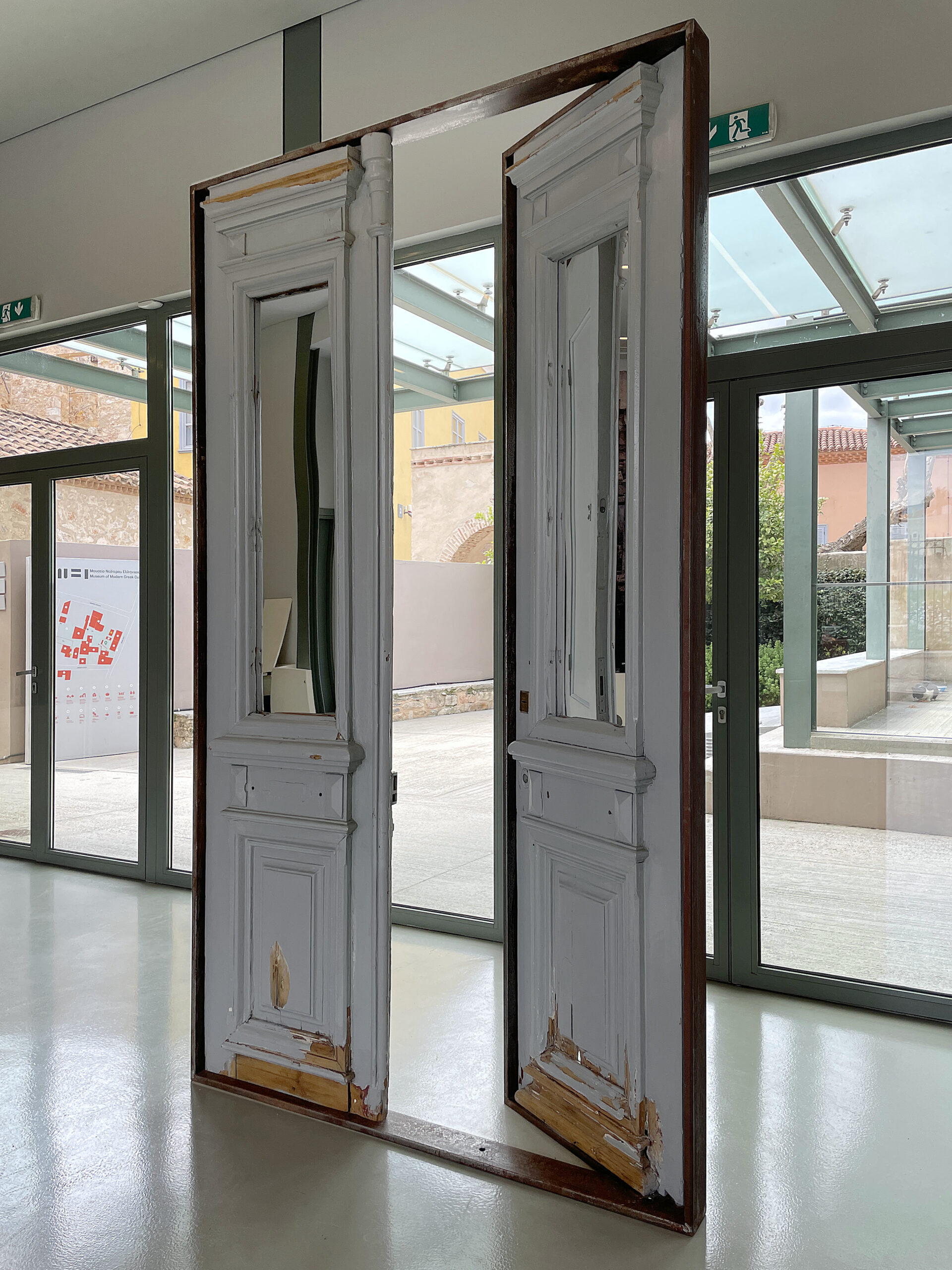 Every house worldwide begins with a door. In Greece, the concept of the door has held particular significance and has been meticulously shaped since antiquity. This form has been translated through the ages and remains evident in all neoclassical buildings. The free-standing installation is encased in a simple iron frame, holding the door as if in the process of being opened, thus inviting visitors towards the museum’s interior. Simultaneously, the upper wooden panels of the old door have been replaced by two mirrors that reflect the people entering the museum, transforming them into both participants and actors within the Greek culture they are about to experience.