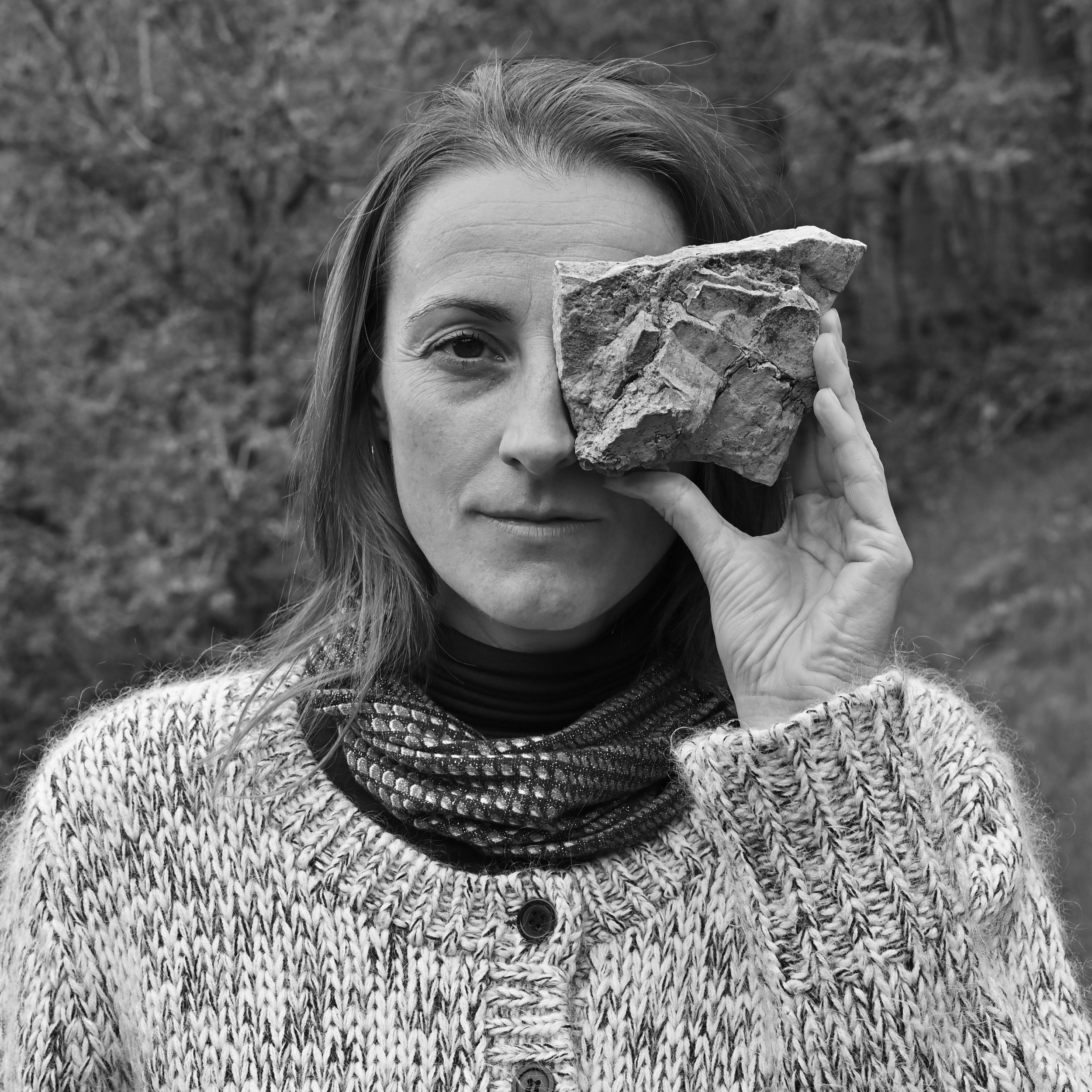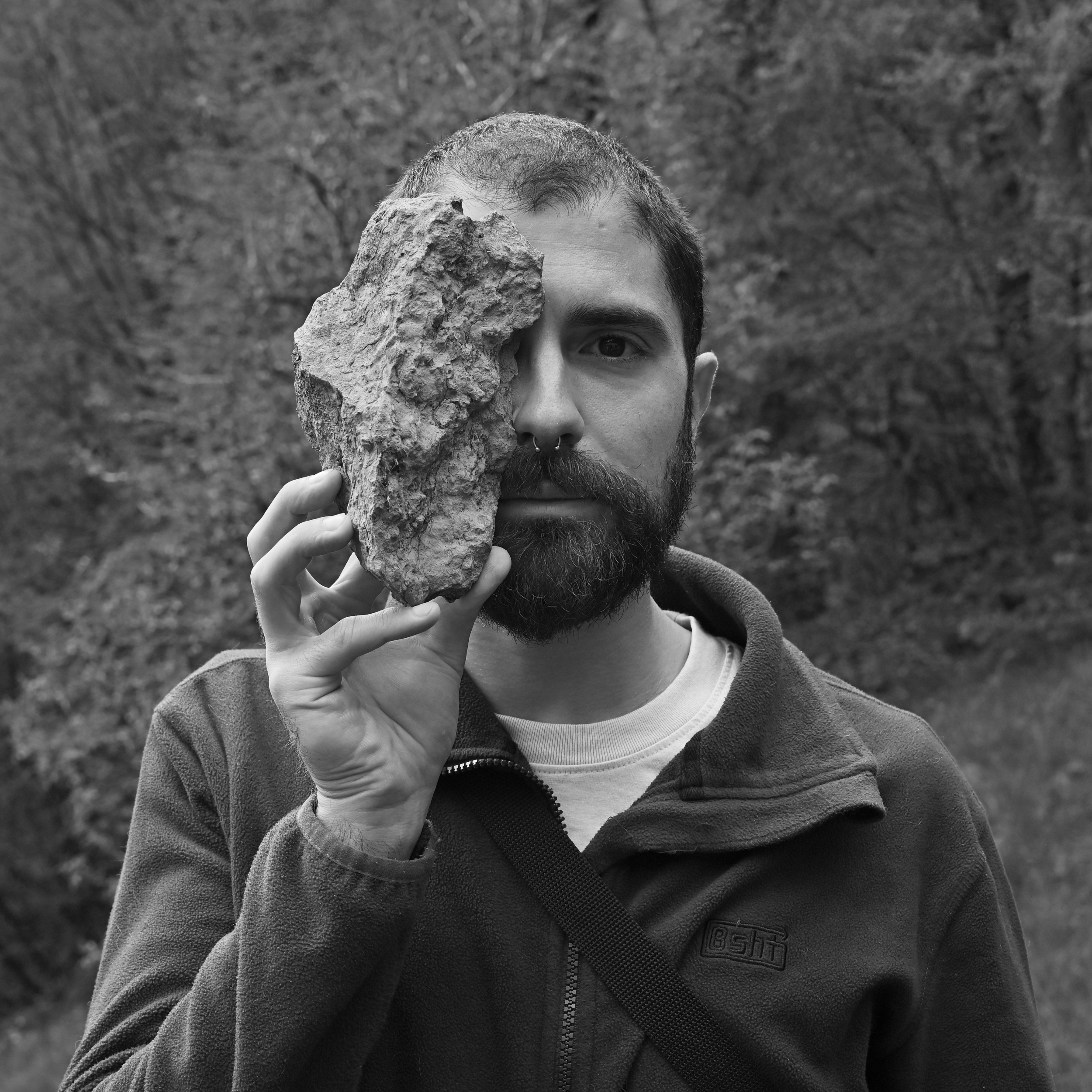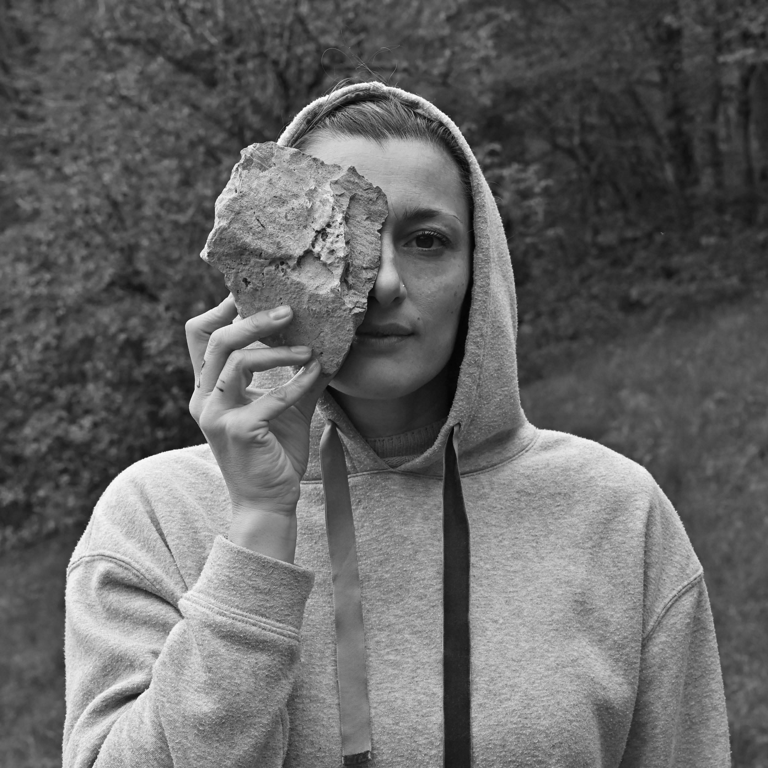 People are asked to search and choose a stone from the wild that they can comfortably carry with one hand. Then they are asked to press it against their face and find a comfortable position that covers half of it. Once they have found a position that feels comfortable, they are photographed with their chosen stone. After the photo shoot, they are invited to take their chosen stone home with them.