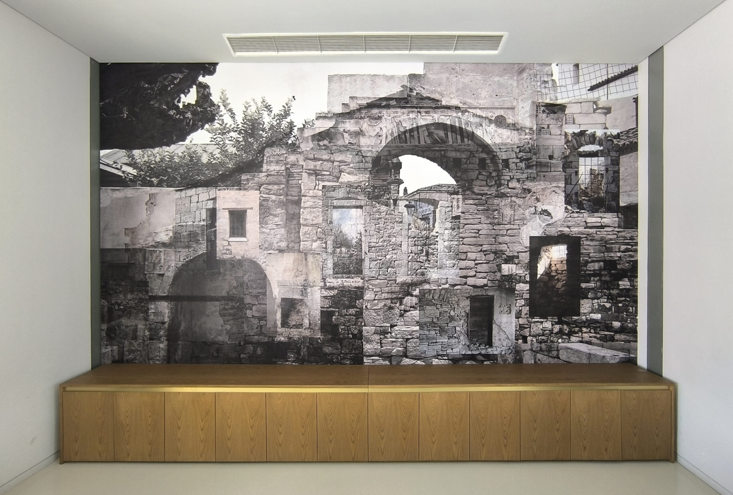 The archetypal form of a house, coupled with the founding material of the stone construct the concept of this art-piece. A contemporary mural, occupying the wall behind the museum ticket office, that narrates the story of modern Greece, from its’ roots to recent times, in a tale made of stone, history and belief.